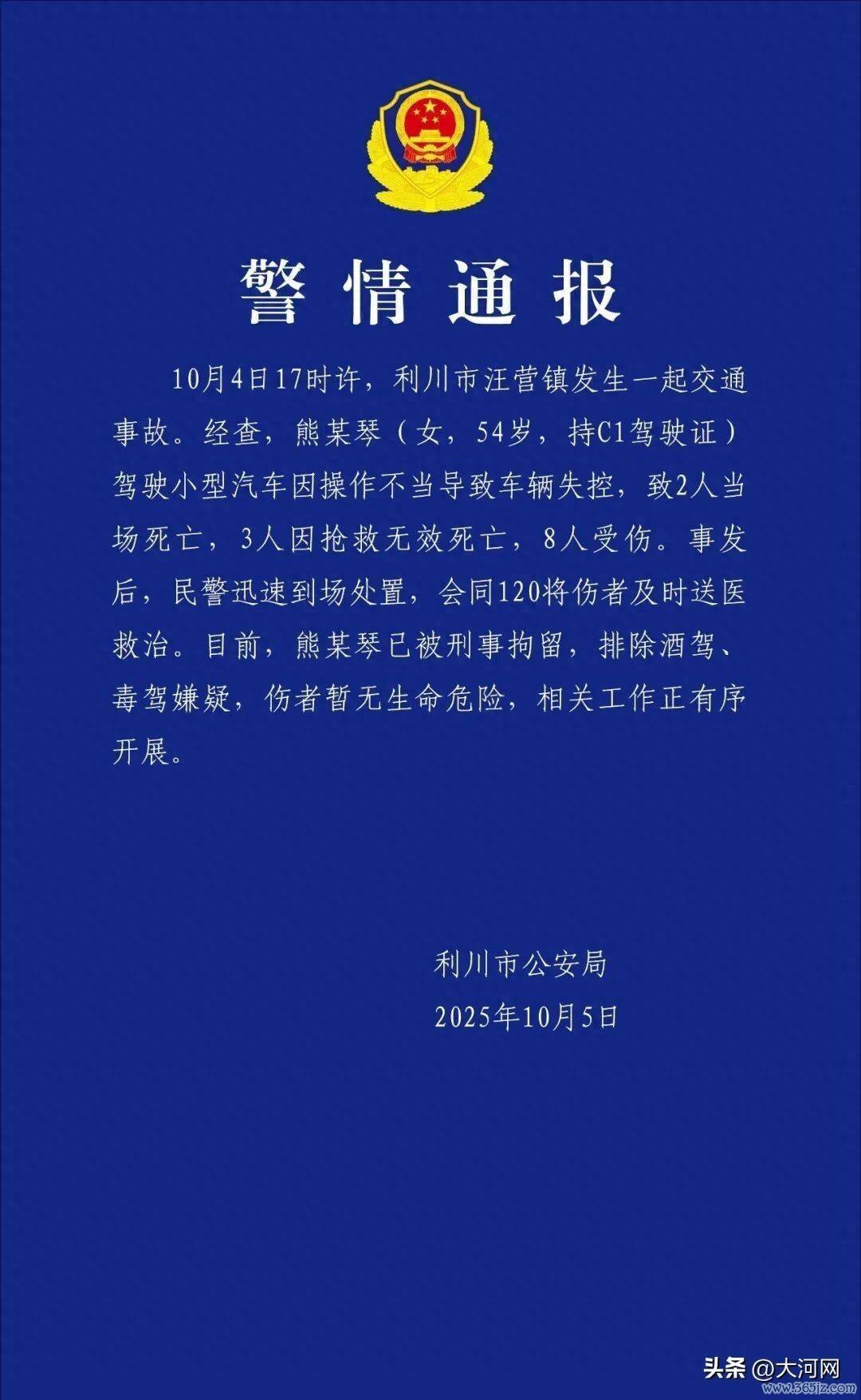 10月4日17时傍边,湖北利川发生一谈交通事故,致2东谈主就地逝世、3东谈主因抢救无效逝世,8东谈主受伤。湖北利川市公安局10月5日凌晨开yun体育网,发布警情通报: