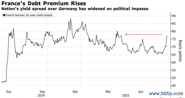 10 年期法国国债收益率咫尺在欧元区中处于最高水平,依然逾越了此前曾处于欧洲主权债务危急中枢的国度,如希腊和葡萄牙。