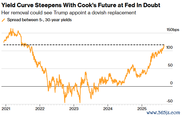 在特朗普股东捣毁好意思联储理事莉萨·库克职务之后,30 年期好意思国国债的收益率上升至 4.9%。在英国,相通期限的国债收益率接近 27 年来的最高点,而日本的国债收益率则已接近历史最高水平。与此同期,由于法国总理告示将举行信任投票,投资者也推高了法国的假贷老本。